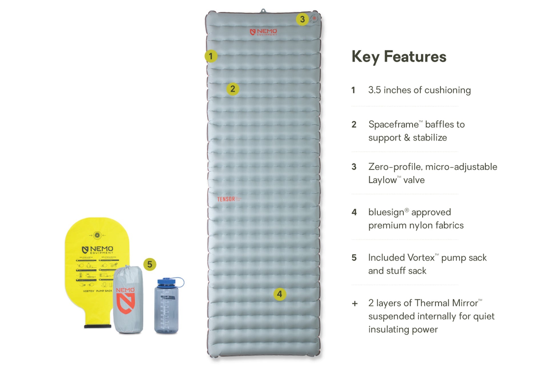 The pad’s interior features NEMO’s proprietary Spaceframe™ baffle design, which utilizes low-stretch fabric trusses to create stable support and offer just the right amount of give — all while avoiding any wobbly waterbed feeling. Inside each baffle are two suspended layers of ultra-thin, metallized Thermal Mirror™ film, which efficiently reflect body heat and contribute to the pad’s overall 5.4 R-value. The layers’ clever floating construction eliminates the crinkling, crunchy sound that many insulated air pads are known for, earning Tensor a reputation for peace and quiet on the trail.